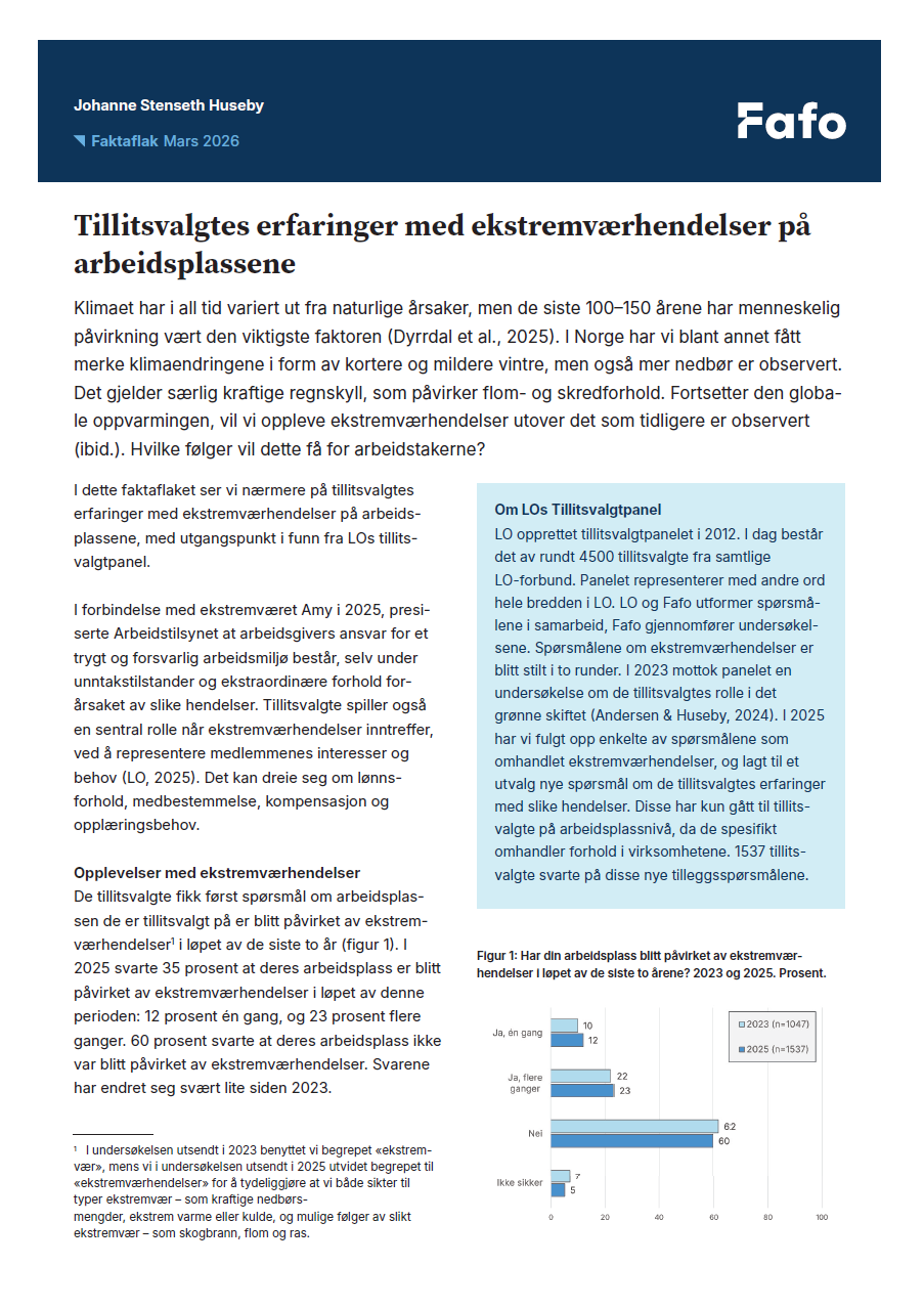 I dette faktaflaket ser vi nærmere på tillitsvalgtes erfaringer med ekstremværhendelser på arbeidsplassene, med utgangspunkt i funn fra LOs tillitsvalgtpanel.